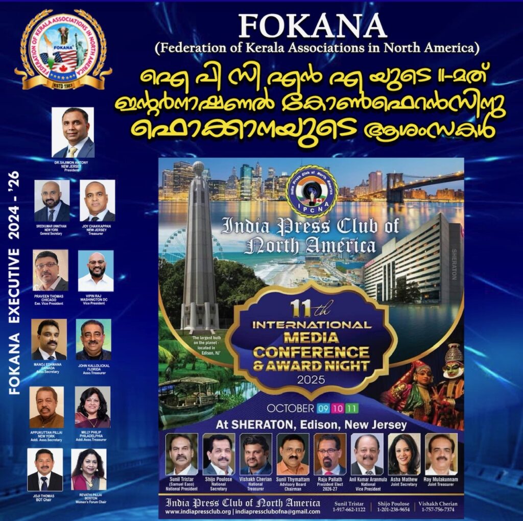 ഇന്ത്യ പ്രസ് ക്ലബ് ഓഫ് നോർത്ത് അമേരിക്കയുടെ ദേശിയ കൺവെൻഷന് ഫൊക്കാനയുടെ ആശംസകൾ