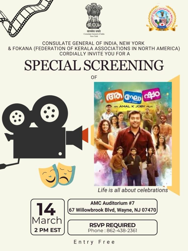 ന്യൂ ജേഴ്സിയിൽ “ആഘോഷം” സിനിമയുടെ പ്രത്യേക പ്രദർശനം: സംഘാടകരായി ഇന്ത്യൻ കോൺസുലെറ്റും ഫൊക്കാനയും